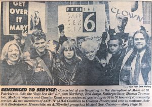 As Northrop relates in the episode, on December 10, 1989, she was arrested during ACT UP’s controversial Stop The Church protest at St. Patrick’s Cathedral. To learn more about the demonstration, read this article or watch this scene from the documentary United in Anger: A History of ACT UP.