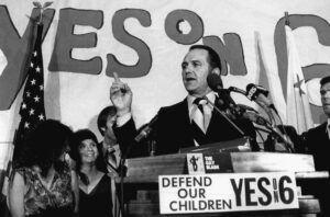 But the Save Our Children campaign’s success was noted. Less than two years after the defeat of the Briggs Initiative in California, the firebrand televangelist Jerry Falwell had established the so-called Moral Majority. It was a coalition of conservative evangelicals hell-bent on influencing the national Republican Party. Until it was dissolved in 1989, the Moral Majority wreaked havoc throughout the country on a wide range of social and cultural issues, from promoting anti-gay laws, to legislating against abortion and pornography, and blocking ratification of the Equal Rights Amendment.