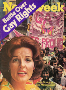 EM: I remember at breakfast one morning picking up—I don’t remember if we subscribed to Time magazine or Newsweek—I remember holding the magazine, and Anita Bryant was on the cover. And, um, I was in a rage and I said that these were all lies.
