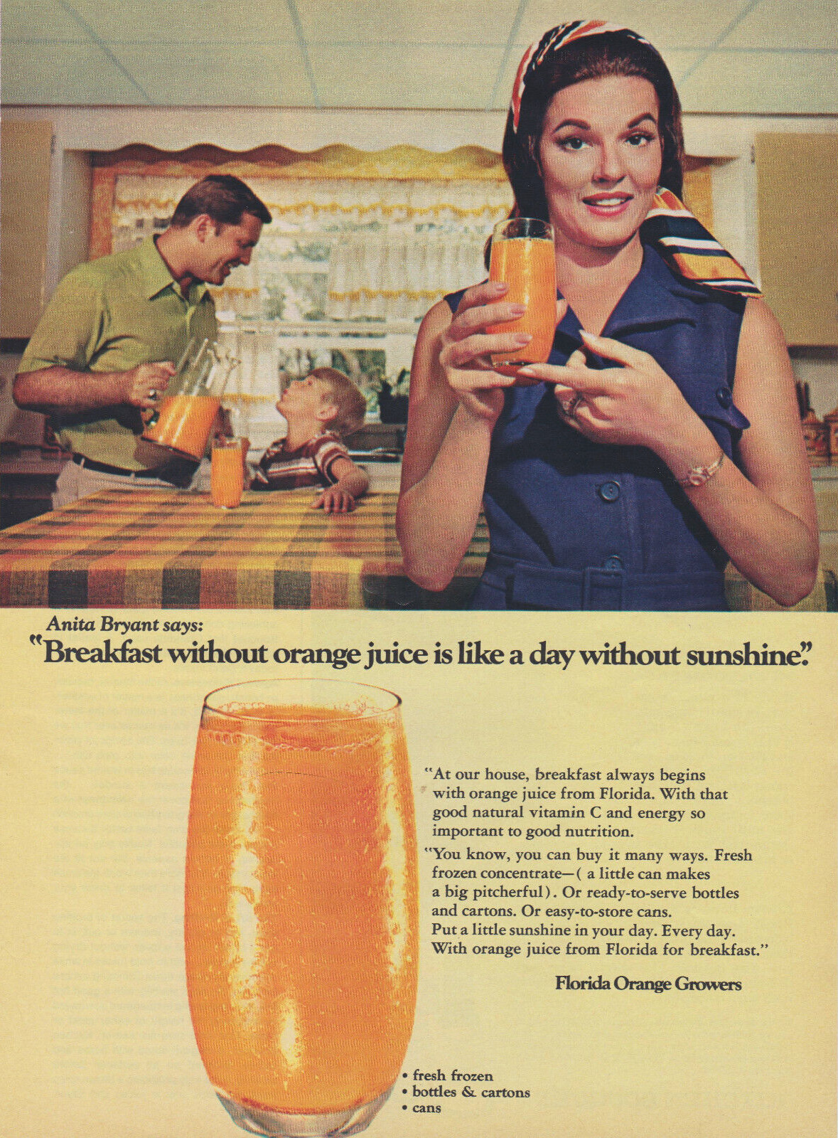 So I knew of Anita Bryant as the orange juice lady. And I recall their slogan was something to the effect, “A day without orange juice is like a day without sunshine.”