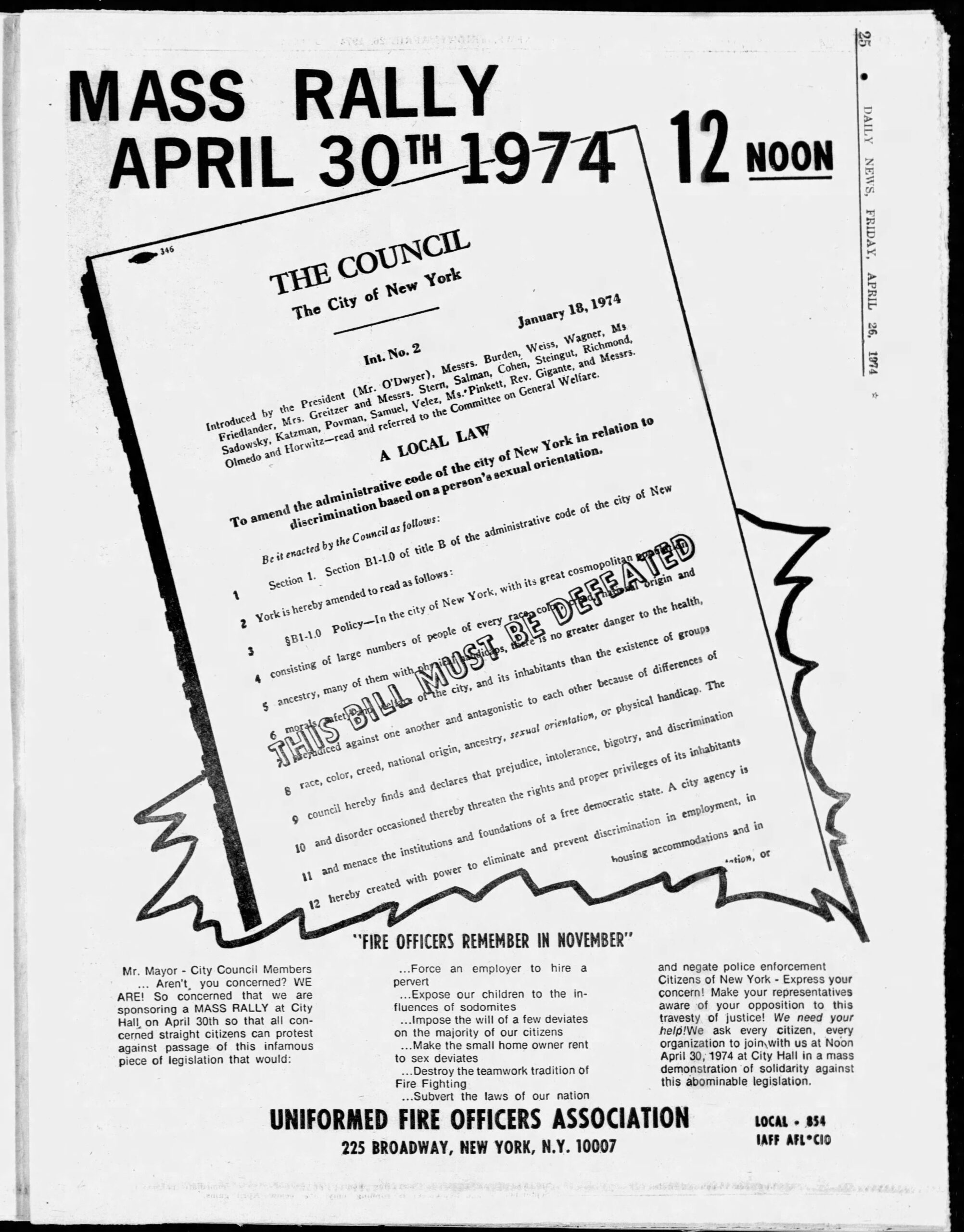 Peter Fisher: And the bill was voted seven to one out of the General Welfare Committee, now to come before the full City Council. And, uh, the stories in the press the next day all said that, uh, in political circles it was assumed that the bill would pass with no difficulty. But, uh, a few days later, a full-page ad appeared in the Daily News, uh, calling for a mass rally called by the, uh, Uniformed, uh, Firefighters Officers Association, interestingly enough, which is headed by one of the men who was accused of beating gays at the, uh, Inner Circle event last year. Anyhow, uh, the union took its funds and placed these ads in the Daily News and in the Long Island Press, where many firemen live. And, uh, they had a lot of sort of ugly language in their advertisement. “The bill would force employers to hire perverts, expose our children to the influence of sodomites,” et cetera, et cetera, et cetera. All the typical hate rhetoric.