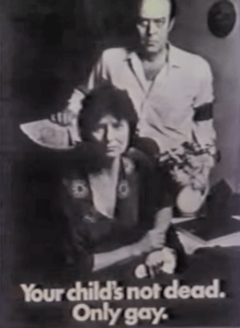 Morty Manford: In historical perspective, the parents’ organization began at a time when police were still raiding bars where gays were; gays had no job protection in any city in this country whatsoever; where there was still the stigma of being gay. The churches said we were sinners, and psychiatrists said we were sick. Capitalists said we were subversive, and communists said we were immoral. And many gays also accepted those prejudices, if, if only tacitly. There was no pro-gay propaganda. The support wasn’t out there.