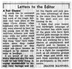 - “Public & Private; No Closet Space,” an op-ed by Anna Quindlen published shortly after Morty Manford’s death (New York Times, May 27, 1992).