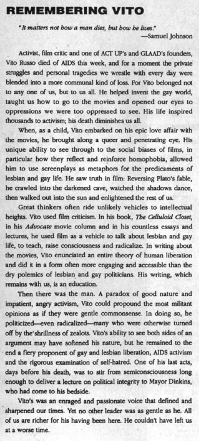 The New York Times published Vito Russo’s obituary, in which Vito was described as a film historian, critic, and advocate for gay rights.