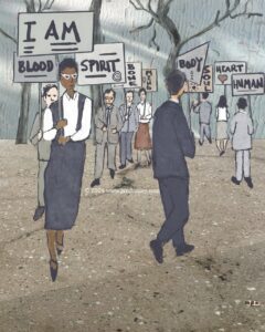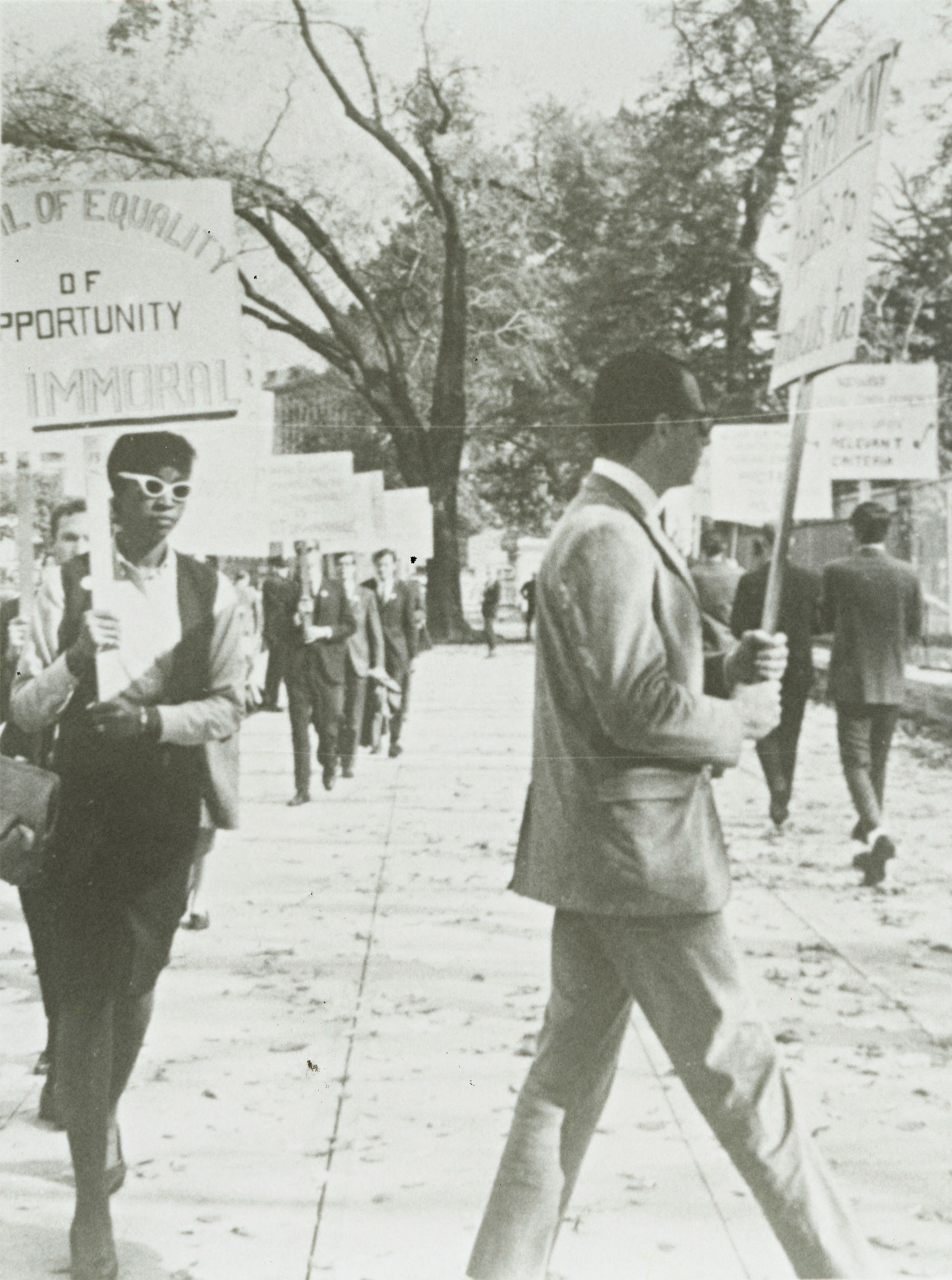 The photos showed a couple of dozen earnest-looking white men in suits walking in circles, holding protest signs. As far as I could tell, there was only one exception—the only woman I could see in the parade of protesting men. A Black woman. Dressed in stylish office-clothes—a white blouse, dark skirt suit, and kitten heels. Her chic, white-framed cat’s-eye sunglasses standing out in the monochrome image. She was carrying a hand-printed sign with bold lettering. The all-caps message reads: “Denial of Equality of Opportunity Is Immoral.”