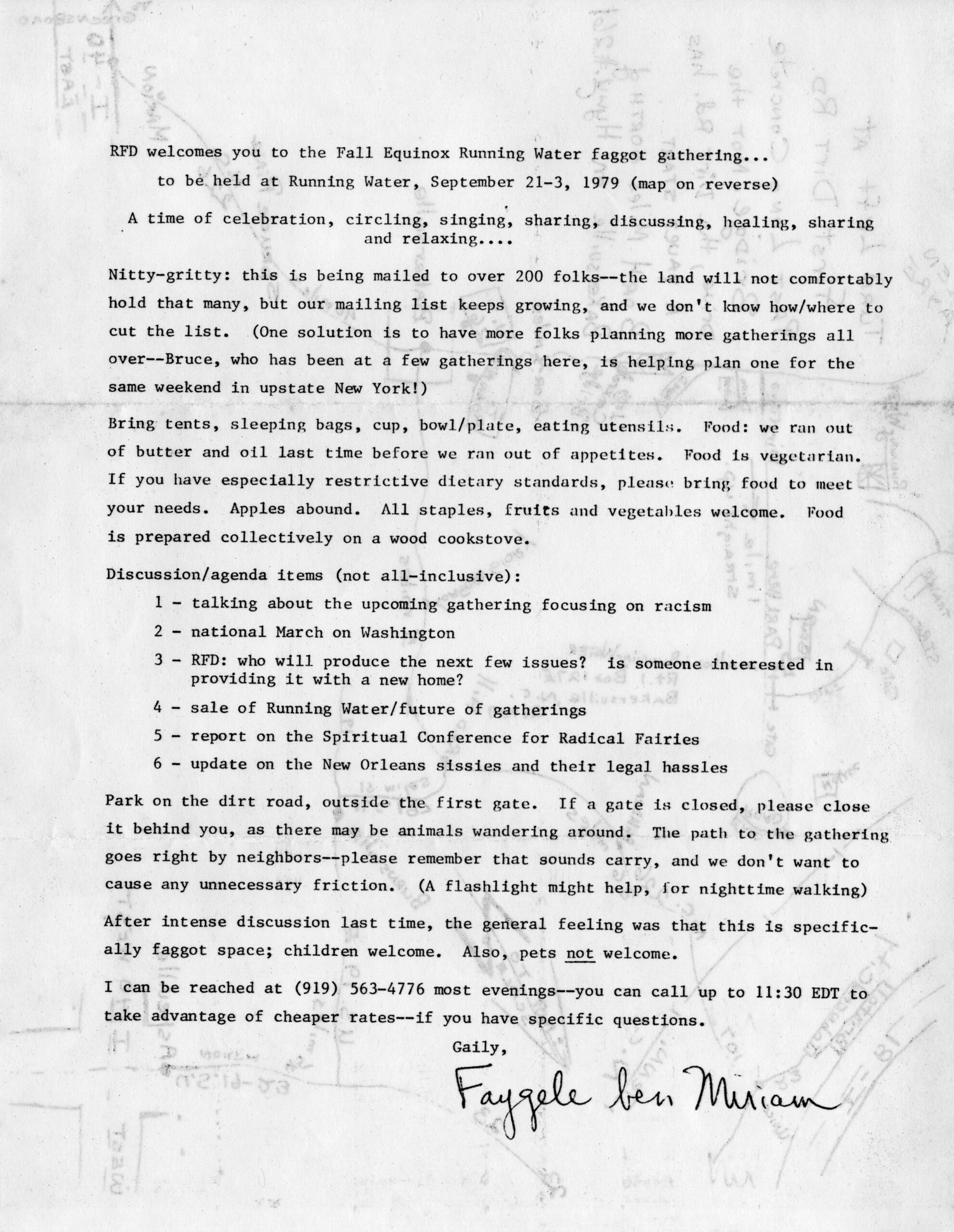 But given, given how we were raised to be political and stand up, it just seemed perfectly natural to me. And I mean, he, even, even to the end—’cause he’s dead now—uh, when I changed my name to Faygele and I sent a letter home, ’cause I was living in Seattle at the time. And it was a good letter, my mother reports, you know, an interesting one, ’cause I was doing lots of things, uh, mostly movement things. And he had enjoyed reading the letter and he got to the closing and saw “Faygele” and just took this letter and crumpled it up and threw it against the far wall. And so from that point on, I never signed a letter home. It was always “Love,” comma, “Me.”