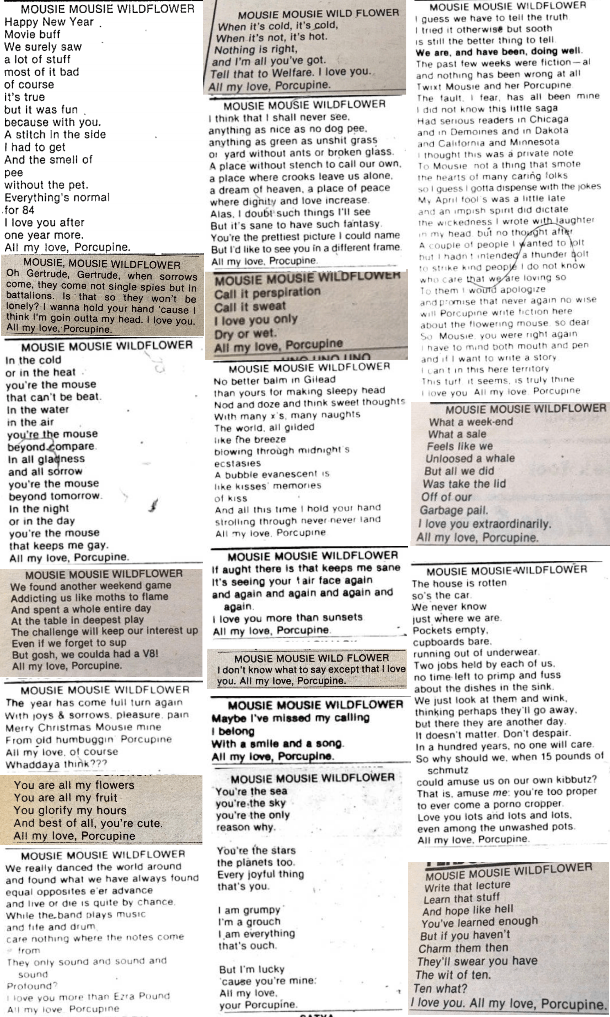 EM Narration: In addition to writing her GCN column, Nancy Walker also managed the paper’s classifieds section for several years. Not the most glamorous assignment, but Nancy made it her own. Each week she kicked off the personal ads with a short poem to Mousie Mousie Wildflower from Porcupine—sweet and silly, sometimes wistful notes, with inside jokes or more profound ruminations. Mousie, of course, was Penny. The doting, if prickly, Porcupine was Nancy.