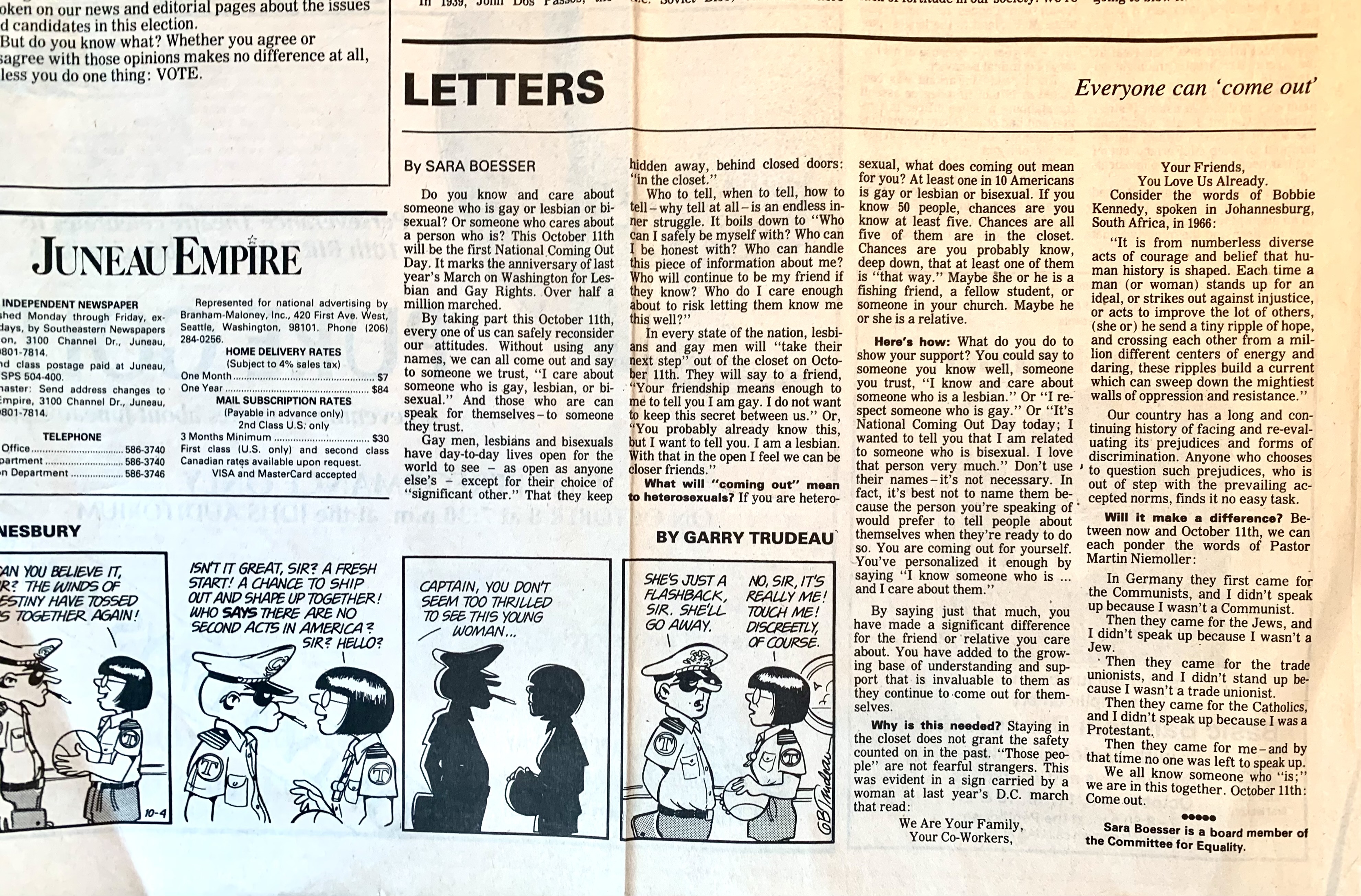EM Narration: In the years after I interviewed Sara Boesser, she became a highly recognized statewide activist on a range of LGBTQ-related equal rights issues, and for a time was the board president of the Juneau chapter of the League of Women Voters—the first out lesbian to hold that position.