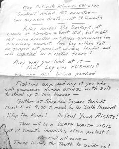 EM Narration: The GAA had leafleted and organized protests within hours of the raid, including the vigil that Vito mentioned and a march that swept up Morty Manford.